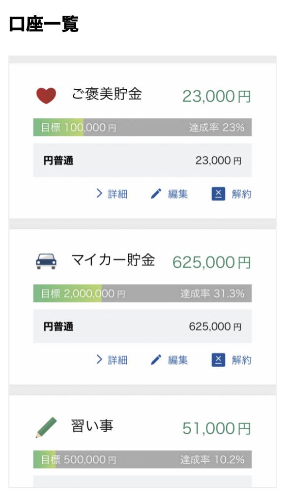 - 目的別口座で、好きな項目を決めて貯金ができる!(dNEOBANKのみ)